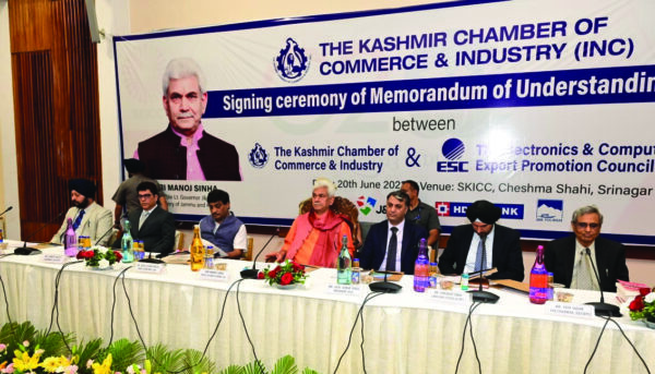 Srinagar: Kashmir Chamber of Commerce and Industry (KCCI) today inked a Memorandum of Understanding (MoU) with Electronics and Computer Software Export Promotion Council of India (ESC) in Electronic and IT Sector in the august presence of Lieutenant Governor Shri Manoj Sinha.