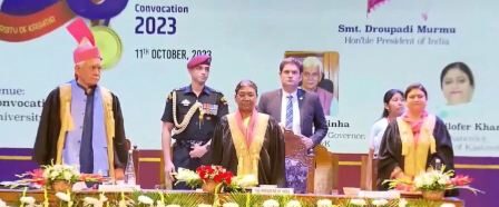 Earlier, President Murmu arrived in Kashmir and she was received by the LG Manoj Sinha at the airport where she was given a guard of honour. From the airport, she air-dashed to the army’s 15 corps headquarters in Srinagar to pay tributes to slain soldiers at the war memorial. She will stay in Srinagar for a night and later in the day, she will interact with the local tribal groups and women Self Help Groups. The president will also attend a civic reception to be hosted in her honour at the Raj Bhavan Srinagar. On Thursday morning, the president will leave for Mata Vaishno Devi shrine in Katra, Jammu tomorrow to inaugurate a remodelled Parvati Bhavan and Sky Walk. Top officials from the police and administration including DGP Dilbagh Singh, ADGP Vijay Kumar, Special DG (CID)RR Swain, SSP Srinagar Rakesh Bhalwal, Divisional Commissioner Kashmir Vijay Kumar Bhiduri, DC Srinagar Aijaz Asad, Mayor SMC Junaid Matoo, Waqf Board chairperson Darakshan Andrabi and others were present in the KU Covocation—(KNO)